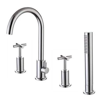 Contemporary styling and a crosshead handle design make this RAK 4 hole deck mounted bath shower mixer tap a real eye catcher. Made from high quality brass, the tap is beautifully finished in chrome. Created with 2 handles and requiring 4 tap holes for proper deck mounted placement. Includes shower handset and hose.