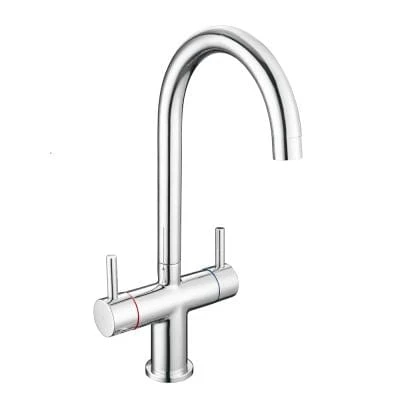 The Adour Twin Lever Chrome Kitchen Mixer Tap is a stylish and functional addition to any kitchen. Made from high-quality brass and stainless steel, this tap is built to last. The chrome finish adds a sleek and modern touch to your kitchen decor. The swan neck shape and twin lever design make it easy to control the water flow and temperature. With a maximum operating pressure of 5 bar and a flow rate of up to 14.5 liters per minute, this tap delivers a powerful and consistent water flow. It is deck mounted and comes with a 10-year guarantee, ensuring peace of mind and long-lasting performance.