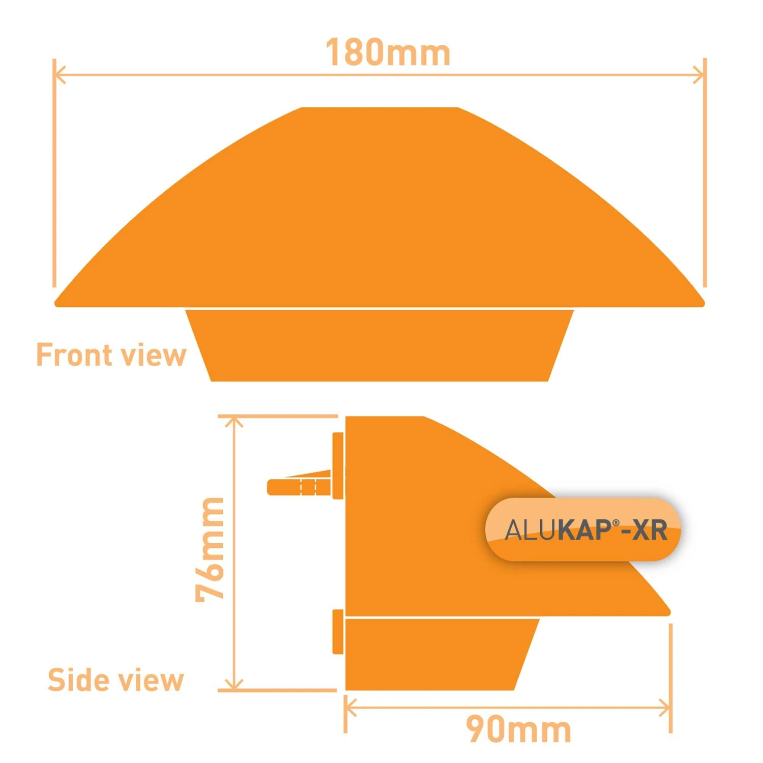 Alukap®-XR Ridge Radius End Cap provides a perfect radial finish to a ridge where the end of the roof has extending hap rafters. The cover for adjoining Alukap®-XR bars is continued the same as the Alukap®-XR Ridge cover to give the best possible cover for more challenging radius end assemblies.