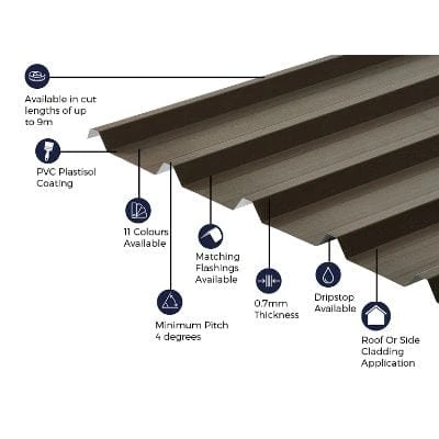 Our 0.7mm thick single skin box profile PVC roof sheets give robust strength roofing sheets. Incorporating 6 x 200mm pitched profiles across the width of the sheet and 32mm profile height the roofing sheets work in both a domestic and a commercial environment.
