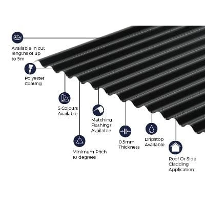 Our steel roof corrugated sheets give the look of a traditional 13/3 corrugated iron cladding profile, and has 13 corrugations of 3 inch/76mm round, with a width coverage of 990mm when installed. This sheet gives the look of traditional corrugated iron cladding that has been used for over a century for a traditional look.