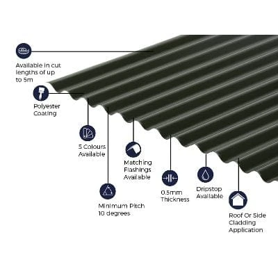Our steel roof corrugated sheets give the look of a traditional 13/3 corrugated iron cladding profile, and has 13 corrugations of 3 inch/76mm round, with a width coverage of 990mm when installed. This sheet gives the look of traditional corrugated iron cladding that has been used for over a century for a traditional look.
