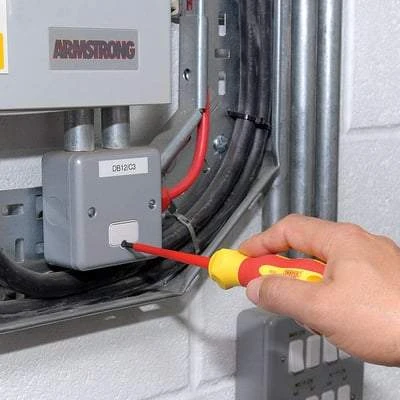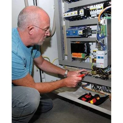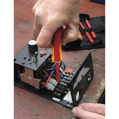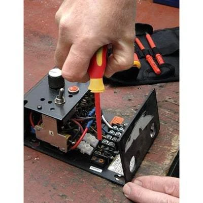 This screwdriver set is tested to 10kV and is suitable for working on live circuits of 1kV AC and 1.5kV DC. Manufactured with SCVM steel blades that are hardened, tempered and chemically blackened for maximum durability. Interchangeable insulated blades deep-set into handles. Choose between precision or high torque types for total safety.