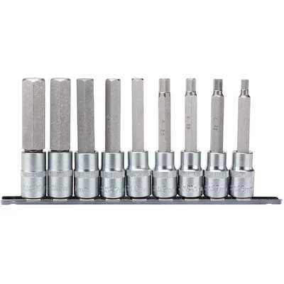 9 sockets fitted with insert bits. All sockets manufactured from hardened and tempered chrome vanadium steel with sand blasted bits of S2 silicon steel. Each socket has a knurled ring for extra grip. Supplied on a steel socket retaining rail.