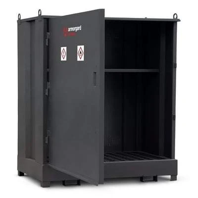 This range is specially designed to safely store a range of containers, such as 50 gallon drums, jerry cans, & IBC containers. Highly robust, the enclosed versions are fitted with heavy-duty doors and 5-lever deadlocks to protect your high value fuel and oil from theft and fire. The DrumBank range is fully compliant with COSHH regulations, as well as including benefits like durable powder coating and easily accessible, fully welded sumps. Built to high specification for 30 minute fire resistance. Wide opening doors and spacious interior for ease of access. A half depth shelf inside provides storage for items such as jerry cans & pumps.