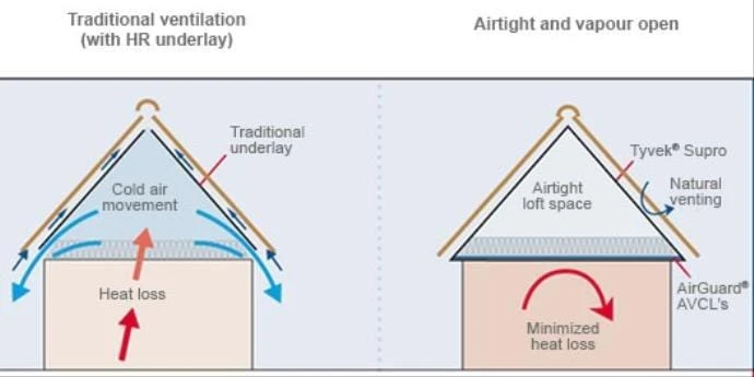 Tyvek Supro does not need any soffit, tile or ridge ventilation, which can save time and money in the construction process. In addition to warm, hybrid and cold roofs, applications include Scottish sarking board systems, low-pitched metal roofs, and wall and floor applications.