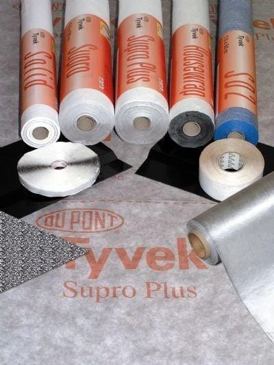 Tyvek Supro is a durable, water resistant membrane that is reinforced with a laminated polypropylene nonwoven. This airtight, vapour-permeable membrane is extremely water-resistant, and can be used for all supported and unsupported pitched roofs.