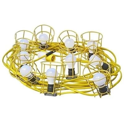 A festoon light set on a 22 metre arctic cable supplied with 10 x bulbs (110 Volt), each bulb is protected by a lightweight yellow plastic cage. These festoon lights will provide a very effective solution to illuminating a large area on site just by hanging the lights in one room and to another across a landing etc., there will be instant light in three locations without shadows that can be caused by tripod lighting.
