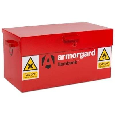 Armorgard Flambank FB1 Flammable Van Box allows the safe storage of chemicals with an integral sump for safety. Extra secure with twin locks with 6mm steel reinforcement around locks. The ultra-tough, lockable vault for storing hazardous chemicals and flammables. As well as exposing individuals to possible risk. Fully welded and tested sump base to prevent leakage, ultra-robust 5-lever deadlocks with anti-drill plates on both sides and anti-cut rollers in deadbolt. High and low level ventilation to prevent build-up of fumes, and flame arrester gauze fitted on all boxes. Also suitable for the safe storage of chemicals.