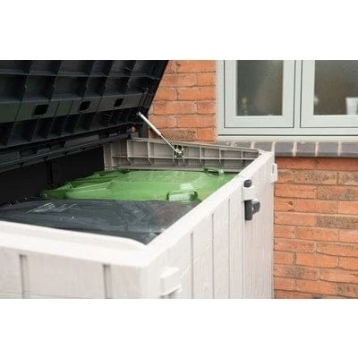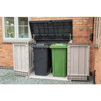 The Extra Large Garden Storage Unit / Bin Store is a flexible storage that offers a generous 1200 litre capacity and great access to its contents with a fully opening front and lid. With a width of 145cm, depth of 82cm and height of 124cm the storage unit is big enough for the storage of a wide range of products from outdoor furniture, garden tools and equipment such as lawnmowers, barbeques or children’s toys and bikes. It has also been designed to house two full-size 240 litre wheelie-bins.