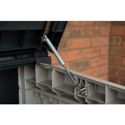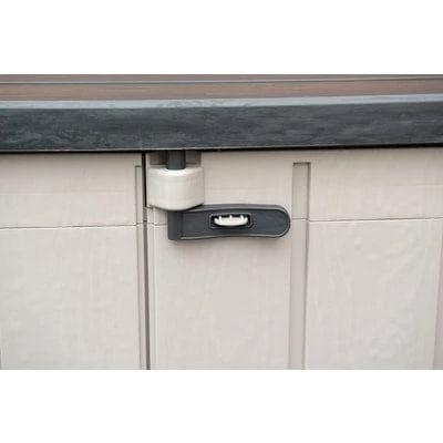 The lid benefits from having two gas pistons that provide assisted lifting of the lid and keep it open when required. The turn handle at the front secures both doors and lid closed and can be locked with the use of a padlock to keep the contents of the store secure.