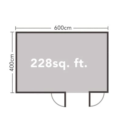 Overall dimensions are 6.24 metres x 4.66 metres (20 x 15 feet) and the front of the roof features a useful 60cm overhang to give some shelter from rain and to keep the worst of the rain off the front of the cabin. The overhang around the sides and back is 20cm. The internal floor dimensions of 5.7m x 3.7m give a total floor area of 21.2 m2 (228 square feet) which which makes this garden building a quick and cost-effective way of extending your living space significantly.