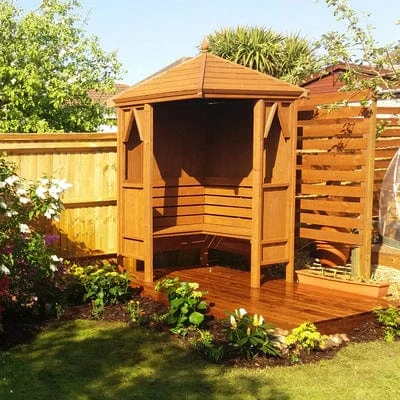 A marvellous way to utilize a corner of your garden, decking or patio, there is plenty of room inside to relax on the comfortable bench seating and, although sheltered from draughts, two large openings allow in air and light.