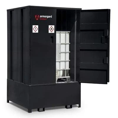 The COSHH compliant Armorgard DrumBank range is specially designed to safely store a range of containers, such as 50 gallon drums, jerry cans, & IBC containers. Highly robust, the enclosed versions are fitted with heavy-duty doors and 5-lever deadlocks to protect your high value fuel and oil from theft and fire. The DrumBank range is fully compliant with COSHH regulations, as well as including benefits like durable powder coating and easily accessible, fully welded sumps. 1 IBC or up to 4x 205 litre drums can be secured inside. Fully welded 1100L sump with raised and removable steel grid flooring. Fork lift skids to raise the unit and make it easy to manoeuvre.