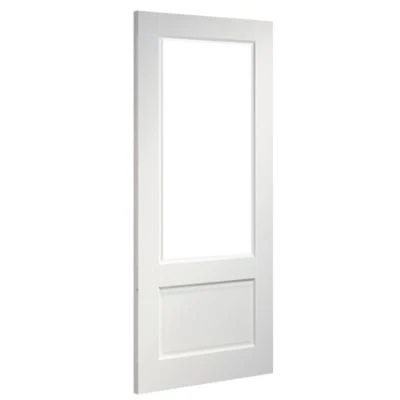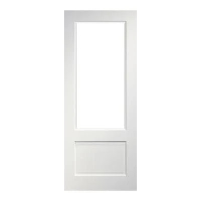In the glazed door, a pane of clear glass is substituted for the larger panel. Beautifully crafted bevel cut edges add depth to this wonderfully chic door.