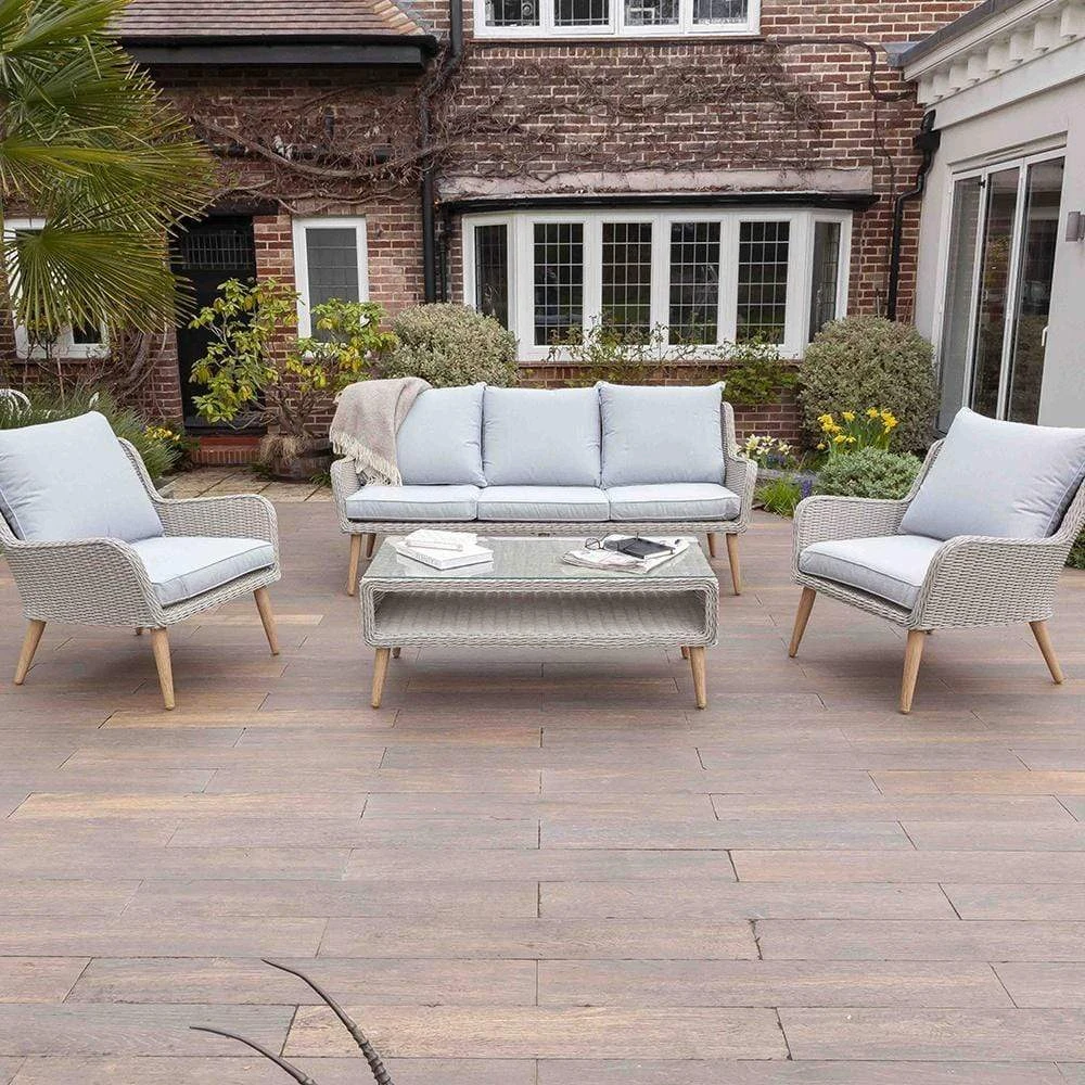 The Nightingale sofa set is designed with luxury All-weather rattan, crafted from a high quality natural weave with varied texture and tone. All cushion covers are machine washable and made exclusively of the highest quality showerproof materials.
