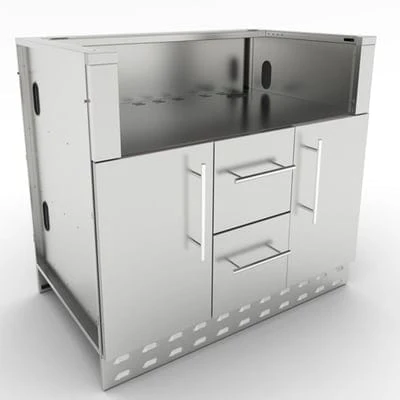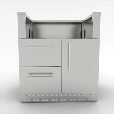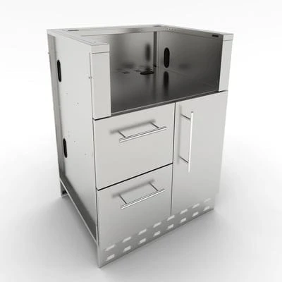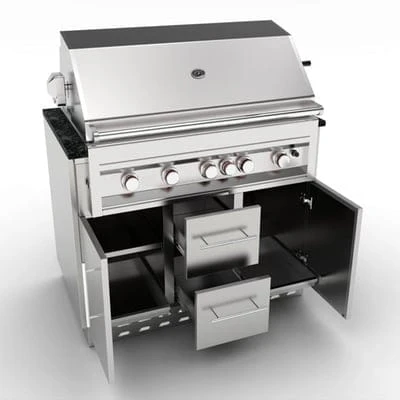 The cabinet comes standard with a Right Side Door Enclosure for a Trash Bin with Two Large Drawers with Ample Storage Space for all your BBQ Utensils, Rubs and Sauces, and it comes Fully Assembled.