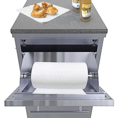 The Sunstone Multifunctional Cabinet is a combo with paper towel holder/cutlery drawer, a large cutting board and a fully insulated lower ice chest and dry storage drawer with swivel drain.