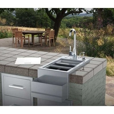 The Sunstone Pro Cocktail Station is double walled and fully Insulated. It’s the perfect All-In-One Cocktail Drink Mixing Station, with a Cut & Clean Cutting Board, Drink Tender, Cocktail Bins and Ice Bucket to use as an Ice Chest. It has a detachable Bottle Rail for easy clean up. The whole unit converts to a wash-up sink with added Soap Dispenser. This unit is a fully functional beverage station that will elevate your Outdoor entertaining experience and complement your Outdoor Kitchen.